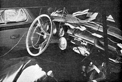 One publication, "Motor Trend," did get an early scoop on the new Volkswagen by catching an unmarked prototype undergoing testing in snow-covered Sweden in early 1961. Note the tape, wires and instrumentation strewn about the car. The white steering wheel was dropped in the production models, as was the chrome strip along the top edge of the door panels.